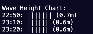 This week was another productive one. I focused on bringing visualization to life in the terminal, reviving the utils.py module with a new function to generate simple ASCII charts for wave data. This sets a solid foundation for displaying forecasts and real-time info in a clear, text-based way—which works for the command-line interface of my project so far.