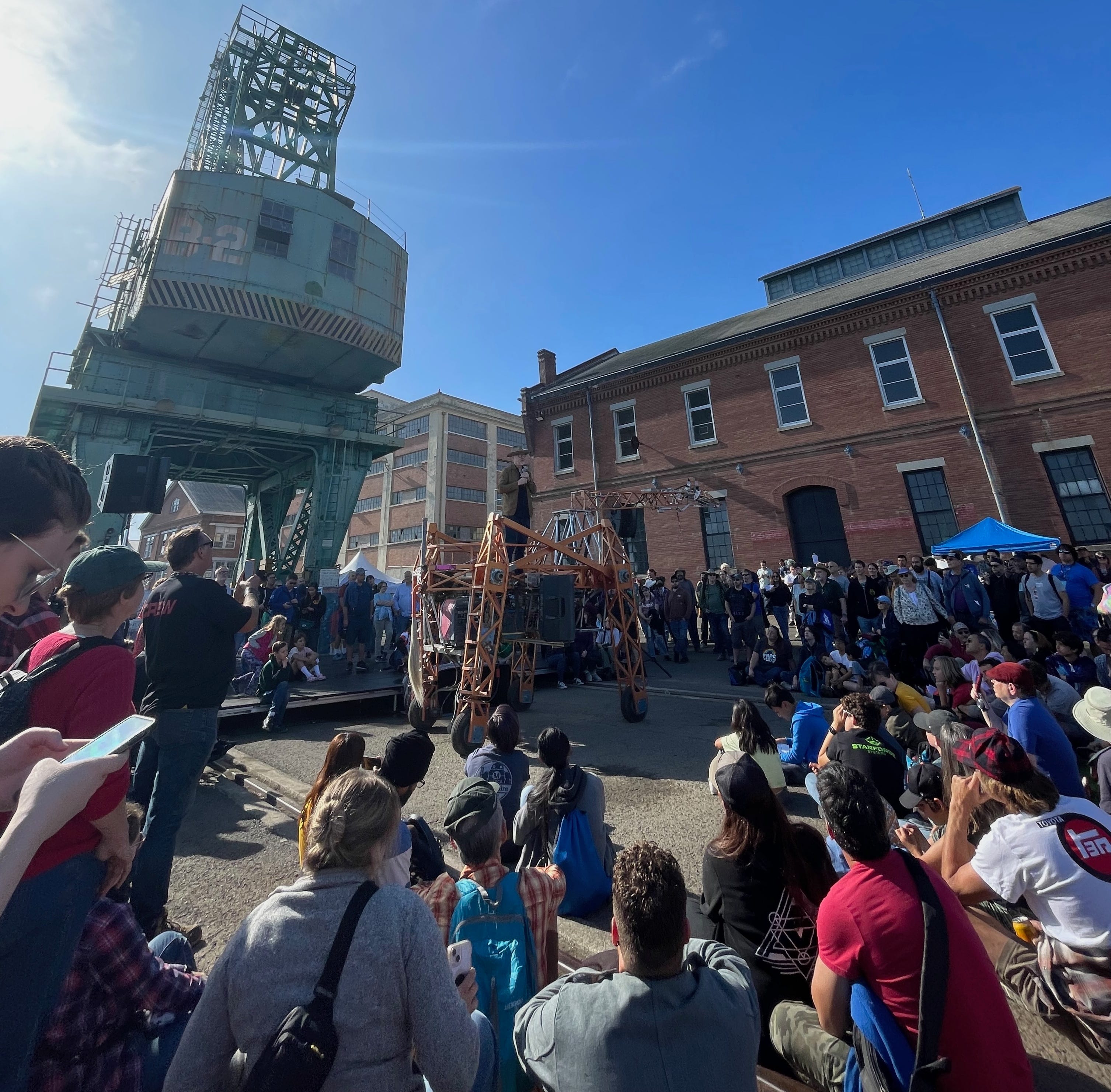 There was a buzz of excitement in the crowd as we moved through the gates and into a small courtyard crisscrossed by train tracks, long since embedded in the concrete. The courtyard was overlooked by a massive, antique industrial crane that towered over the small space. The first rays of sunshine peaked through the fog which was burning off around the Mare Island Shipyard when my nervous conversation was drowned out by an eruption of applause. Down the old promenade came Adam Savage, the man we were all waiting for, riding on an animatronic giraffe.