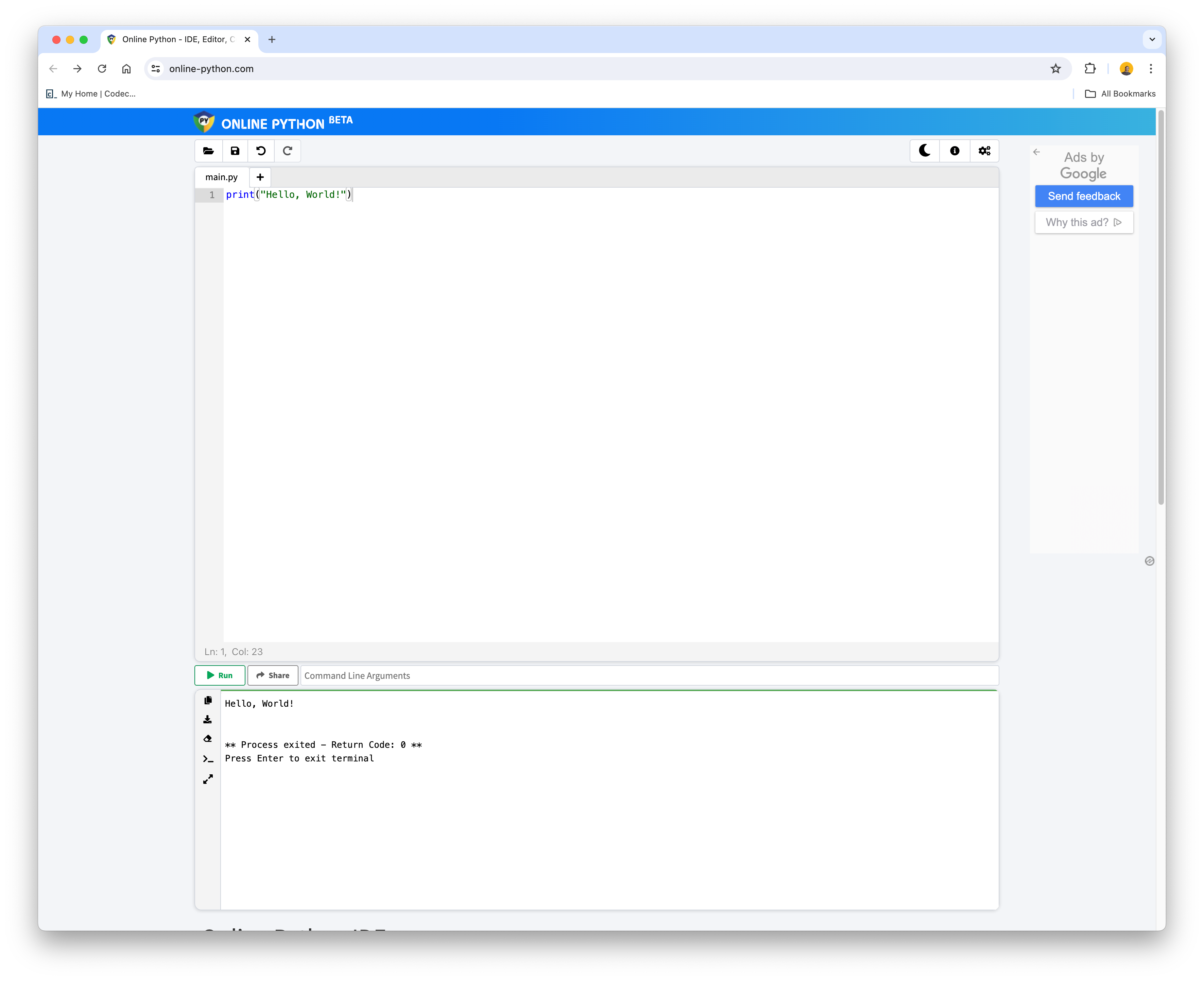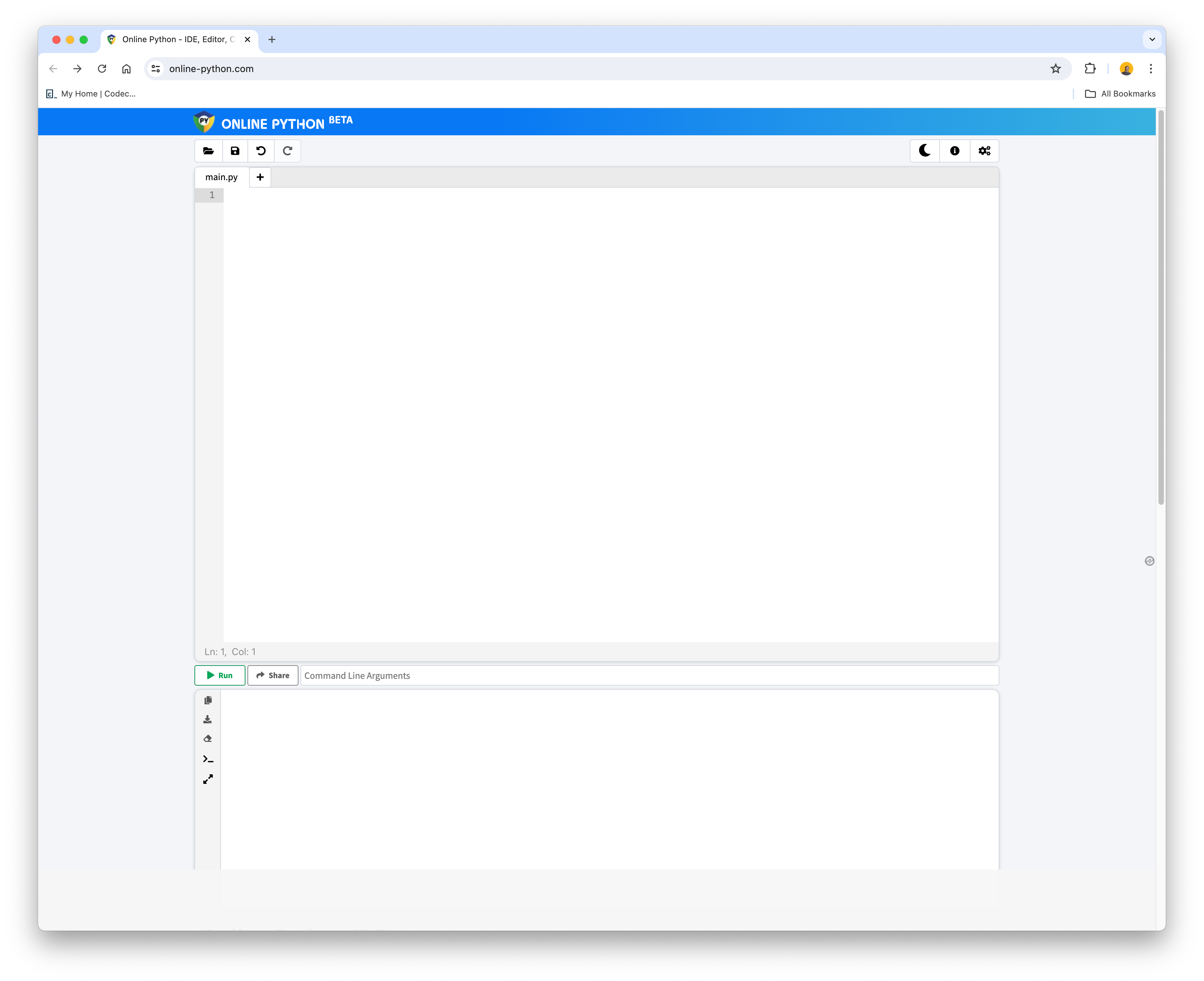 We’re going to use a website called online-python.com (I am not affiliated with them), which will allow us to run our code without actually going through the hassle of setting up our developer environment. If you don’t know what that means, it’s okay. In short, a developer environment is all the infrastructure we set up (usually on our own computer) that allows us to read, write, and run code.